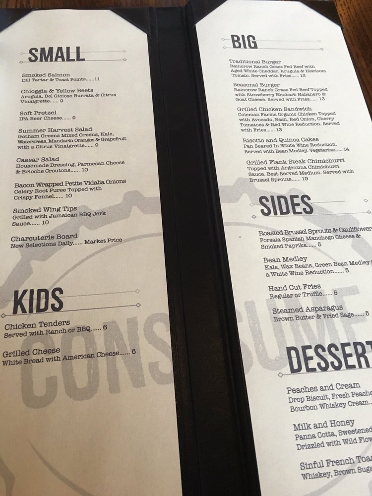 "Consume" at Foodjoyy is a gastropub beer bar located in Lake Zurich, IL. Offering a wide range of amenities and options, including takeout, reservations, pescatarian and vegan dishes, wheelchair accessibility, and even cryptocurrency payments, Consume is a trendy and casual spot perfect for any occasion. The menu boasts a variety of beverages from sour and tart ales to happy ales and ciders. Customers rave about the flavorful dishes, generous portions, and excellent service. From carnitas enchiladas with mole rojo to the best burgers in town and buffalo wings, Consume has something for everyone. Whether you're looking for a nightcap, a quick bite, or a group outing, Consume promises a memorable experience with top-notch food and drinks. So why not stop by, relax, and enjoy the diverse menu offerings at Consume?